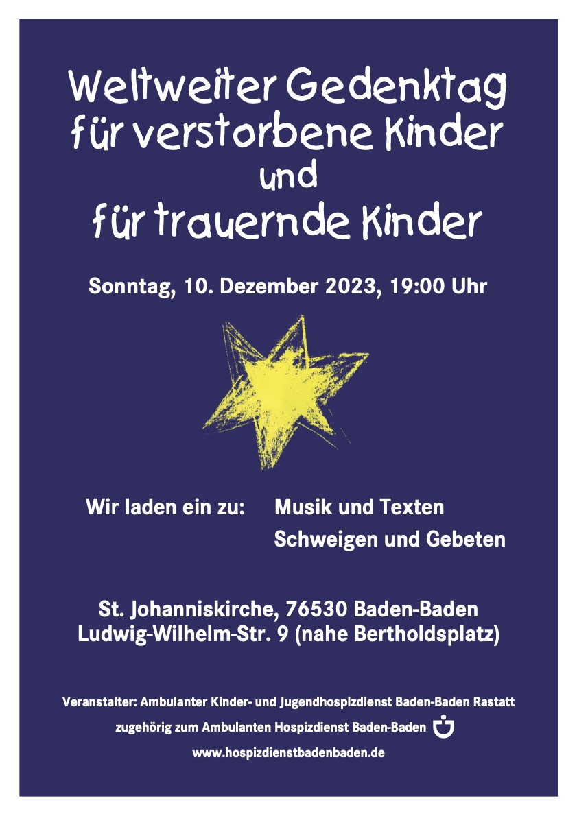 Zum traditionell weltweit stattfindenden Gedenktag für verstorbene Kinder, jeweils am zweiten Sonntag im Dezember, lädt der Ambulante Kinder- und Jugendhospizdienst Baden-Baden Rastatt zur „Gedenkfeier für verstorbene und trauernde Kinder“ ein: