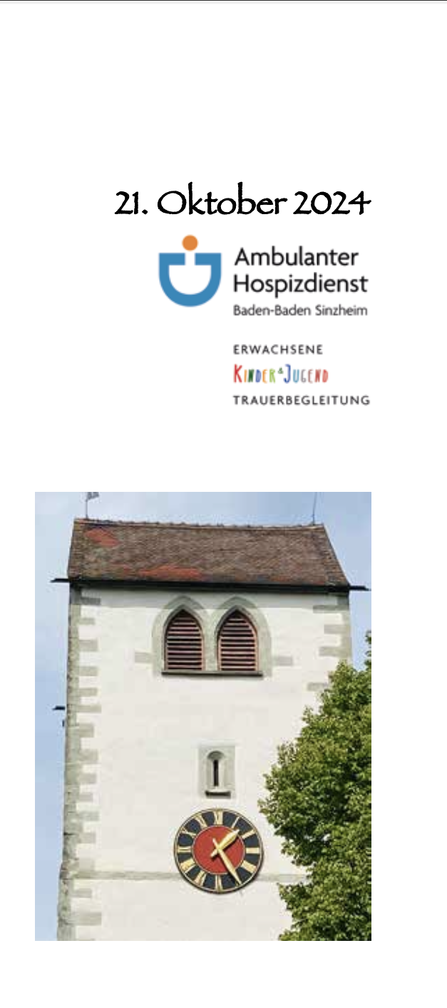 Der Ambulante Hospizdienst Baden-Baden Sinzheim lädt zu diesem Vortrag am Montag, den 21.10.24 um 19 Uhr in den Dietrich-Bonhoeffer-Saal, Bertholdstr. 6 ein. Der Eintritt ist frei.